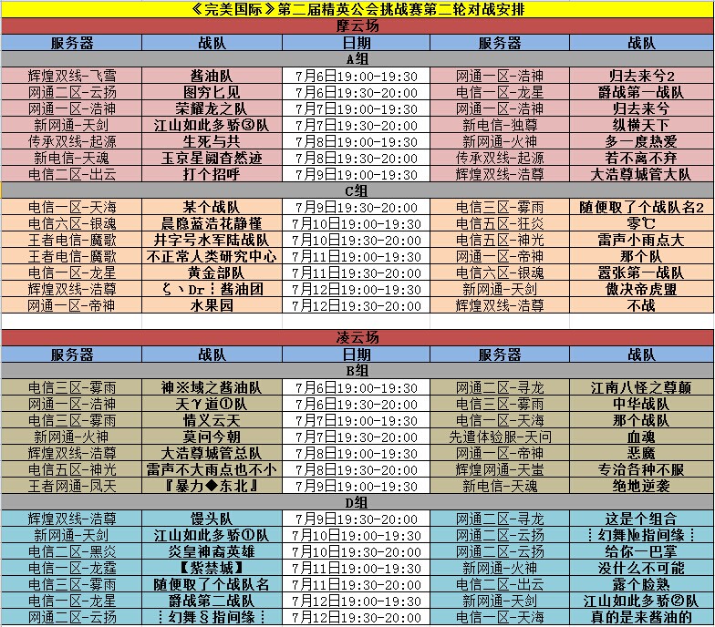 《完美国际》第二届精英公会挑战赛,第二轮比赛将于7月6日晚19:00开启,请参赛队伍确认好自己的比赛时间,不要错过比赛。感谢您的支持。