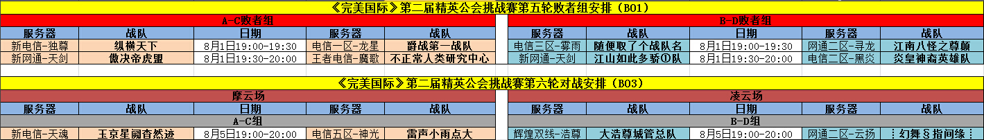 《完美国际》第二届精英公会挑战赛,败者第五轮比赛将于8月1日晚19:00开启,请参赛队伍确认好自己的比赛时间,不要错过比赛。感谢您的支持。
