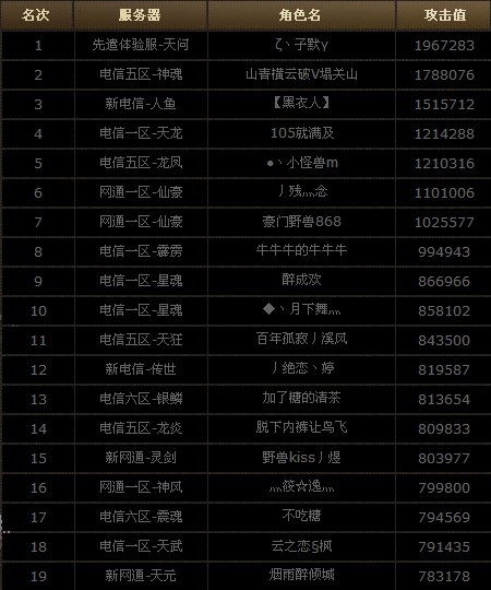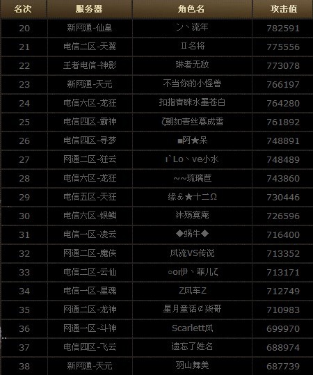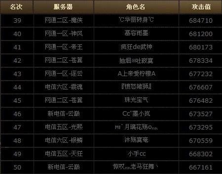 全服攻击力排行榜前50名榜单: